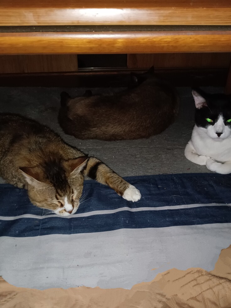 家の子達はストーブも付いてます、電気じゅうたんでまったりですが、やっと朝から雨の中の仕事からそのままの餌やりをして、帰って来ました。大雨降りますと配達員が少なくなるので、仕事も忙しくなりました。いつもより稼げましたが、全身ずぶ濡れでした🥶