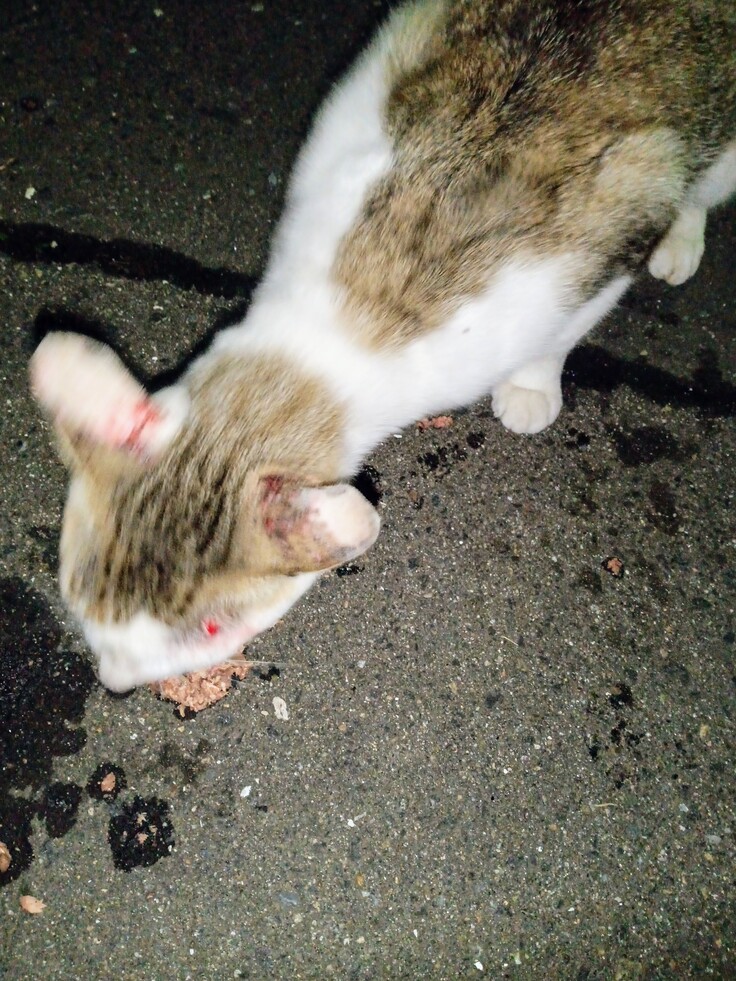 2日間も姿を現さなかった疥癬の子はやっと昨日公園の裏の餌場に居ました、なのですが、頭を見るとなんとま〜真っ赤な血がでていました😱傷も増えている様に見えます💦喧嘩で付いたのでしょうか😰自分で掻いたのでしょうか?痛々しい姿に驚きました💦3日前にレボリューションをつけたのですが、少し量も多めに付けたのですが、効かなかったのでしょうか〜😵 早く捕獲して病院で疥癬も見てもらおうと思っていたのですが、全然捕獲器に入ってくれません💦