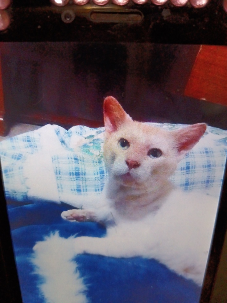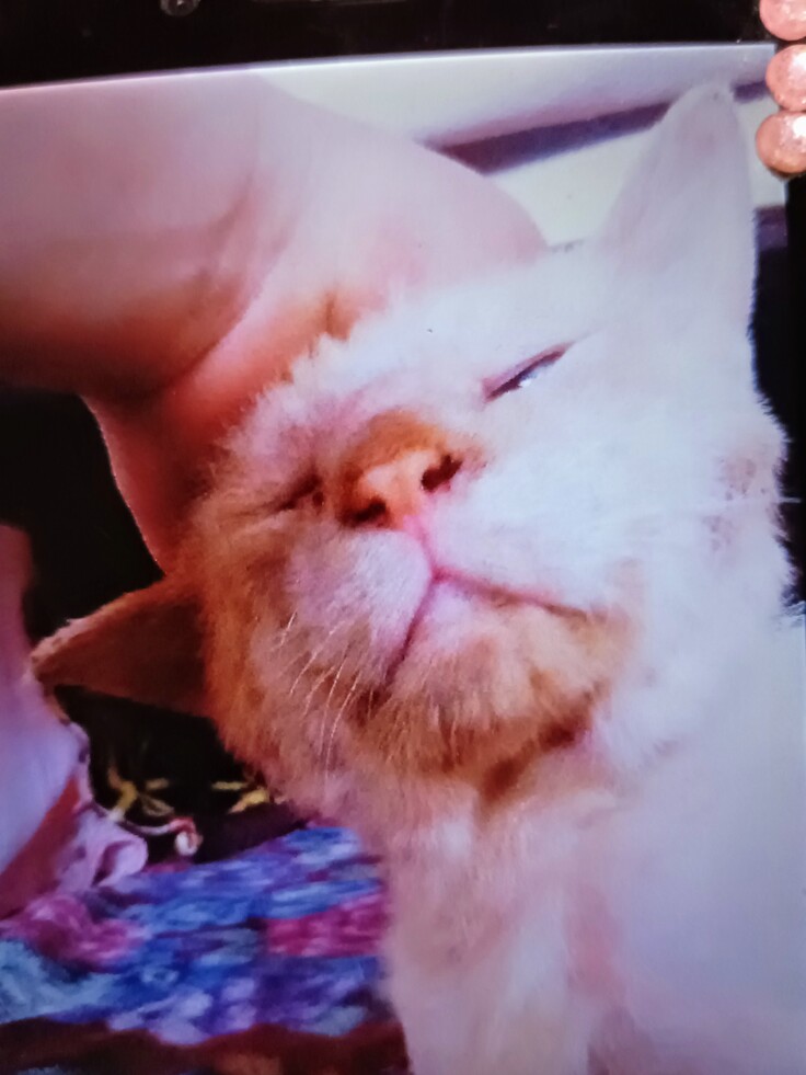 人に懐いているので、とても可愛かったのですが、先住猫達とは喧嘩をしてしまっていたので、一緒に遊ばせる事は無理でした💦 その後はボランテイアの知り合いに引き取ってもらいましたが、2年前に電話が来ました、この子が肝臓の病気で亡くなったとの事でした😭 前の電話から写した写真なので、見づらくてすいません💦