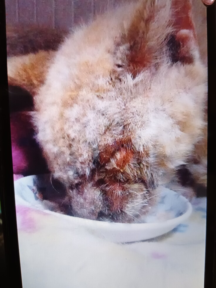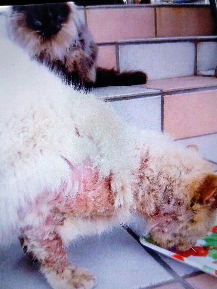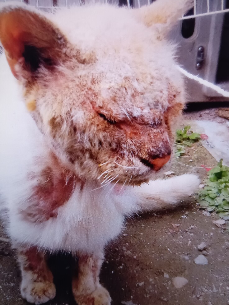 にゃんちゃんの餌やりに行った時に突然現れて疥癬のオス猫が一緒にご飯を食べていました💦何処から来たのか?凄くびっくりしました💦人馴れしているし、全身がこんなにも酷い状態で、目も開けられなくて、目からは膿が出