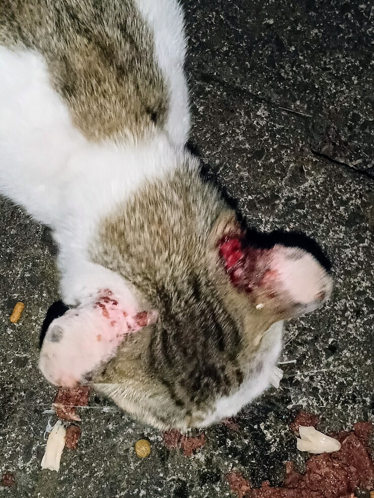 この疥癬の子は、2日に一回しか姿を現しません💦頭が又血だらけになっていました😱 薬が足りないのかと思い、車に戻ってレボリューションを少し頭に付けてやりました。早く良くなると良いのですが😔