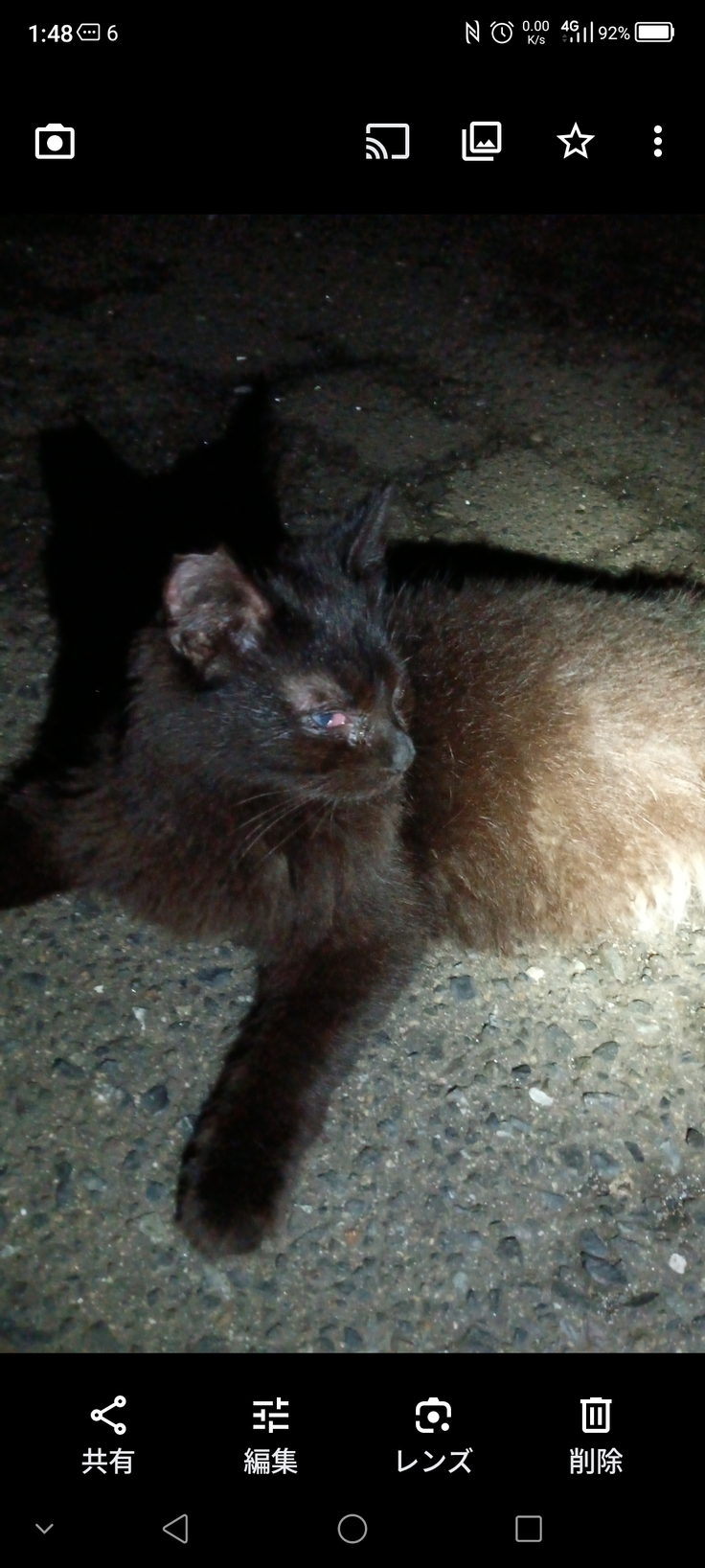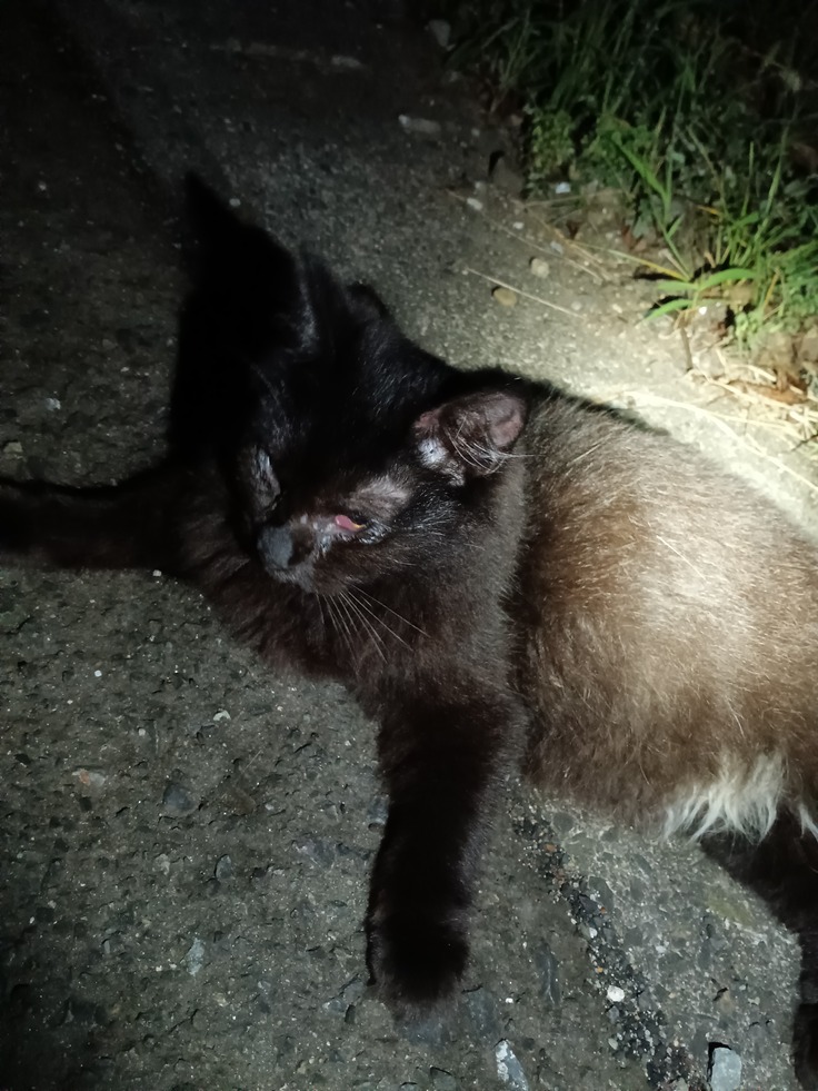 突然横からもう一匹の長毛の黒猫が近寄って来ました、ん?全く同じ小ブタで、オッポが少ししか無いのが目の前に現れました…何が起きたのか、疲れて幻覚を見てしまっているのか?🥵呆然とする私に、目の腫れている方の子がずっとスリスリをしてくるのです、元気な方とお互い顔を合わせて、元気な方が別の方に歩いていきました😵 なんと斗真のそっくりさんが居たのです😱 それも耳カットされていました。見たらオス猫君でした😮 なんとも摩訶不思議な現実〜😵💫😵💫お腹に白い毛があるのまで全く一緒でした💦