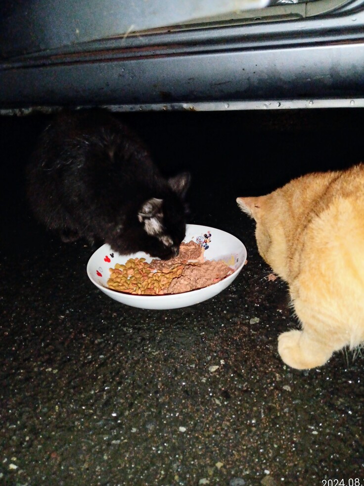 今日は台風で、夜はずっと雨でした💦 お陰様で配達員が少ないので、仕事もと切れませんでした🙂夜中の1時まで配達してから餌やりに来ましたが、斗真のそっくりさんはごびしょ濡れでタマ君とご飯を待っていました。 なんと、カリカリと缶詰めをあげたらむしゃむしゃと声を出しながら勢い良くご飯を食べてくれました😭 昨日の薬が効いたようです🙏目ヤニも少しだけでした、目の充血もピンク色に変わっていました😀 お口の炎症が抑えられたのか、ご飯も喉を通ったんですね😊 本物の斗真よりもなつこくて困りました、全然足元から離れません💦歩く時も足元にくっついて来るので、何度も私が転びそうになってしまったり、この子を踏んづけたりしていました💦 電話のカメラモードも何故か今日は写真がキレイに取れました🙄 フラッシュが効いているので、黒猫の体が写りにくいです💦