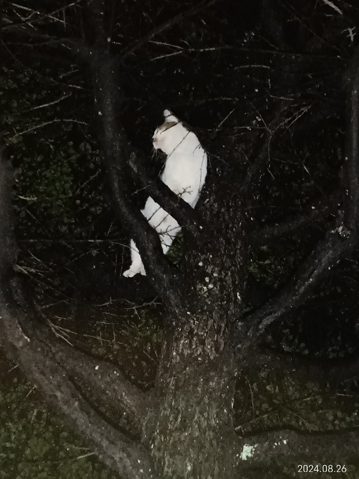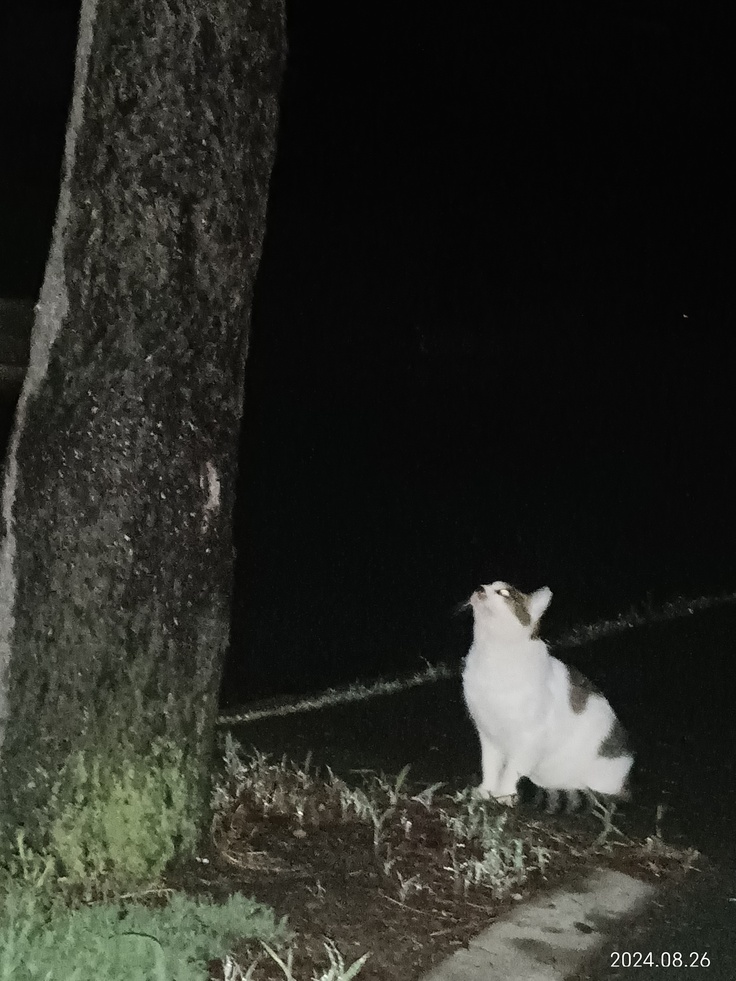 こっちでは、風花ちゃんがご飯を待っていましたが、おばあちゃん猫のモンちゃんの姿はありませんでした。その時にシンディーも出てきましたので、2匹分を用意していたら、風花は未だ1歳なのに、気が強くて色んな猫達を追い掛け回しています💦 ケンカにならなければいいけどと思っていた所、風花が木の上を見つめていました、