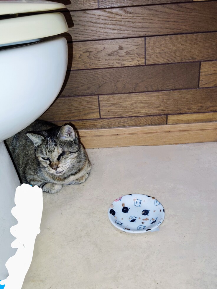 片目のチャッピーちゃんも保護してからは思いのほかすっごく大人しい子でびっくりしました😅 もっと鳴いて外に出たいのかと思っていましたが、全然鳴きませんので、近所迷惑も無く過ごして居ますが、時たま居ないと思っていましたら、なんとも臭い所に隠れて居ました💦 出る気が無いようなので、ついでに食事もそちらで済ませました😮