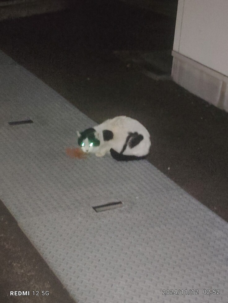 市営住宅と公園の野良猫達の餌をやり終えて帰り道に見たことの無い猫を見かけました、ご飯食べる?と聞いたら、猫が止まりましたので、車から降りてご飯をあげました。 オス猫みたいですが耳を見たら未去勢でした~💦