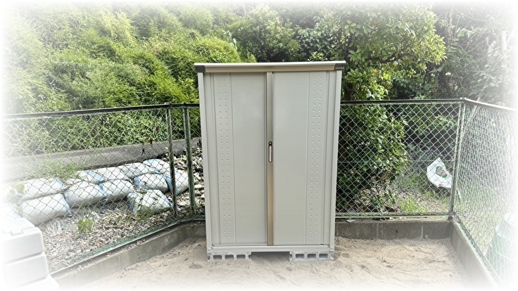 まず、砂場道具を入れるための物置を設置しました!