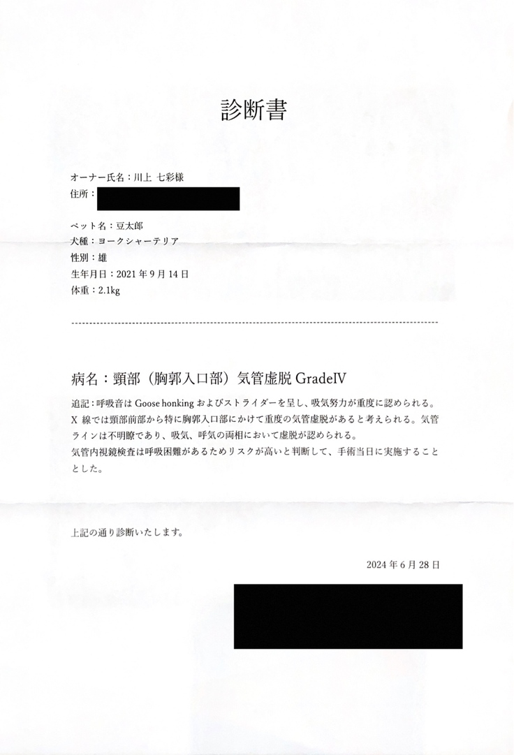 2024年の4月に重度な気管虚脱と診断されました。このままだと死に至ってしまいます。毎日ルンルンで行っていた大好きなお散歩も今では行けない状態です。 温暖化の気候は、気管虚脱のままですと苦しい時期が続きます。また重度の気管虚脱の為、水を飲む時も咳き込んでしまう状態です。 今は気管拡張剤とステロイドを飲んでいますが、徐々に病気は進行しています。 今、豆太郎は気管の半分以上が潰れている状態です。かかりつけの病院では手術できず、先生が紹介してくださった呼吸器専門の手術成功率の高い他県の病院で手術を検討しております。手術費用は85万円程かかると説明を受けました。