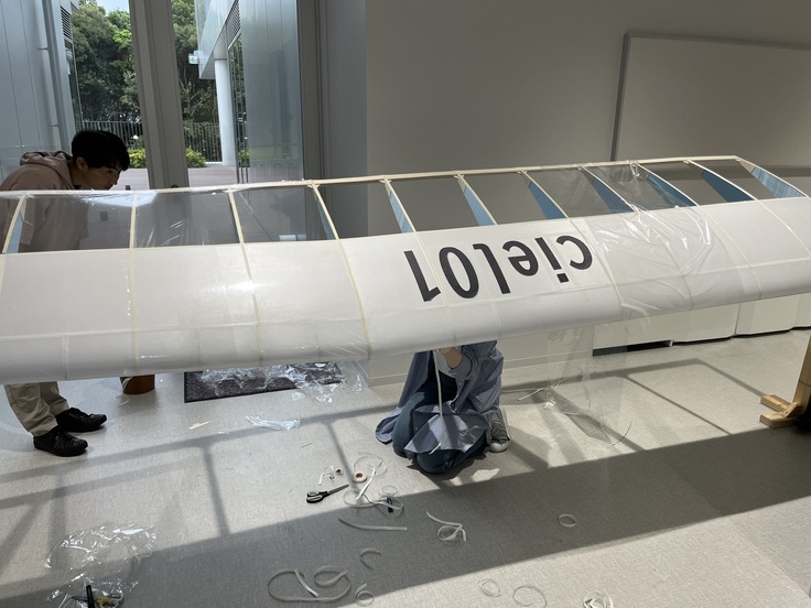 大会当日まで残りちょうど1ヶ月。サークルメンバーほぼ全員が集まり、ついに翼すべてにフィルムを貼り終えることができました!現3年は試作翼の製作の際に一度フィルム貼りを行いましたが、1,2年生は初めてのフィルム貼りでした。少しの緩みやしわ、たわみなども許されない難しい作業でしたが何度も行っていく中で、みんな正確性も上がっていき、素早く作業を行えました。