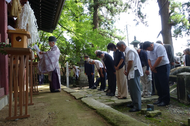 鳩ヶ嶺八幡宮の「随神門」改修安全祈願祭が、8月26日(月)に鳩ヶ嶺八幡宮の随神門前に、40人【随神門・参向殿改修特別委員、鳩ヶ嶺八幡宮氏子総代、改修請負業者(株)カナメ】が参列して行われました。