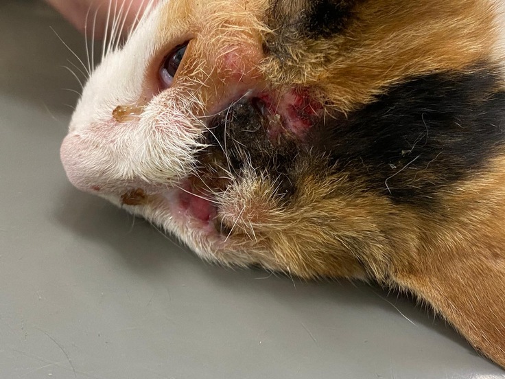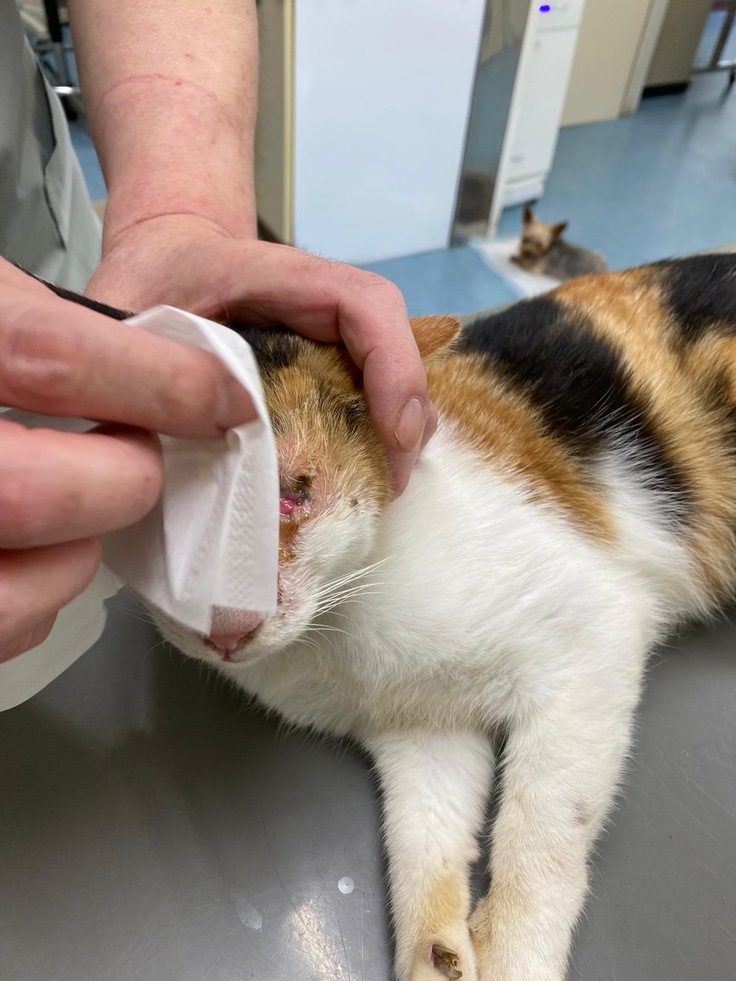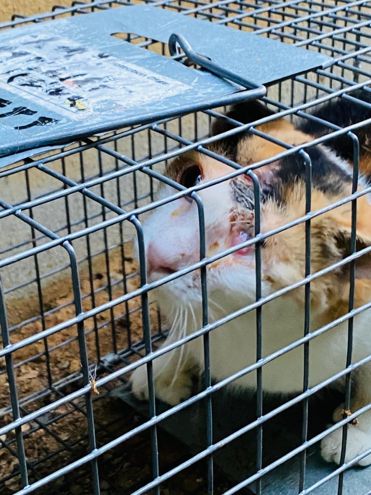 ひどく怪我をした様子のメス猫を捕獲しました。