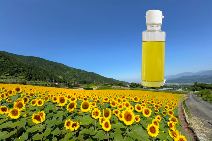 耕作放棄地で「売れる農作物」を生産することはマンパワー的にも技術的にもハードルが高いので、園地を整え、一面のひまわり畑にしていきます。そのひまわり畑整備から得られるメリットは耕作放棄地の解消と、美しい景観、そしてひまわりの種から得られる「ひまわり油」です。