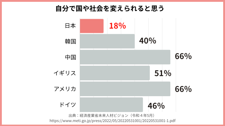 また、経済産業省の未来人材ビジョン(令和4年)が18歳を対象に行った調査では、自分で国や社会を変えられると思うと回答したのは18%でした。