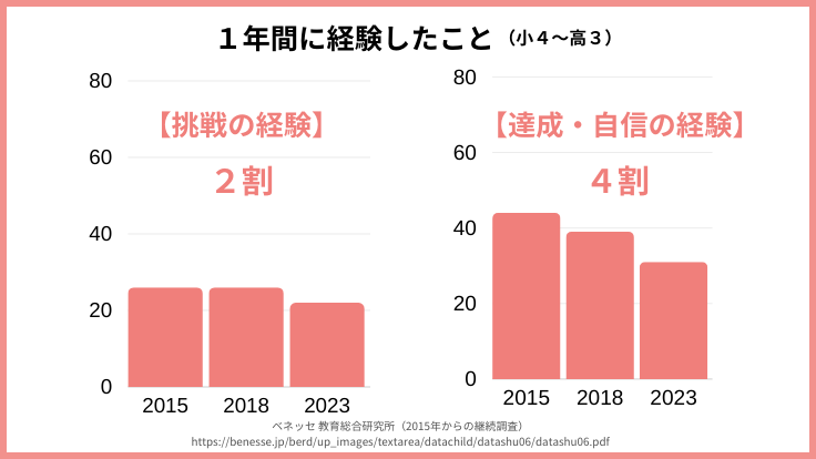 ベネッセ教育研究所が2015年から現在まで継続して行っている調査から、1年間で達成・自信の経験や挑戦の経験をした子どもたちが非常に少ないことが分かります。