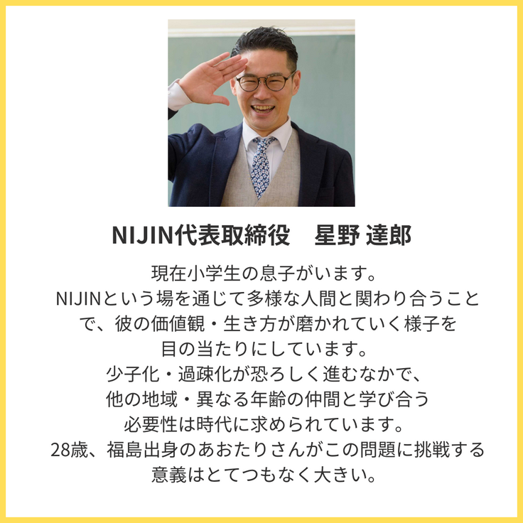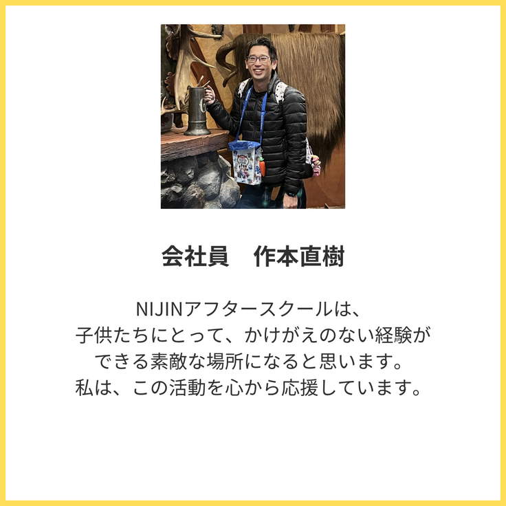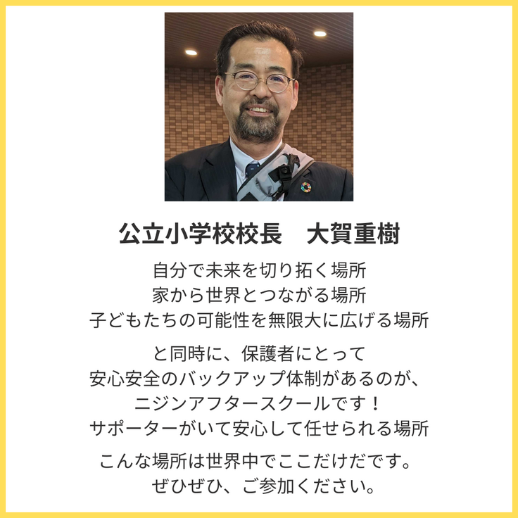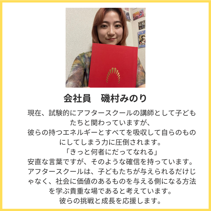 私は、子どもたちの可能性を最大限に引き出す刺激的な放課後を、NIJINアフタースクールで創っていきます。