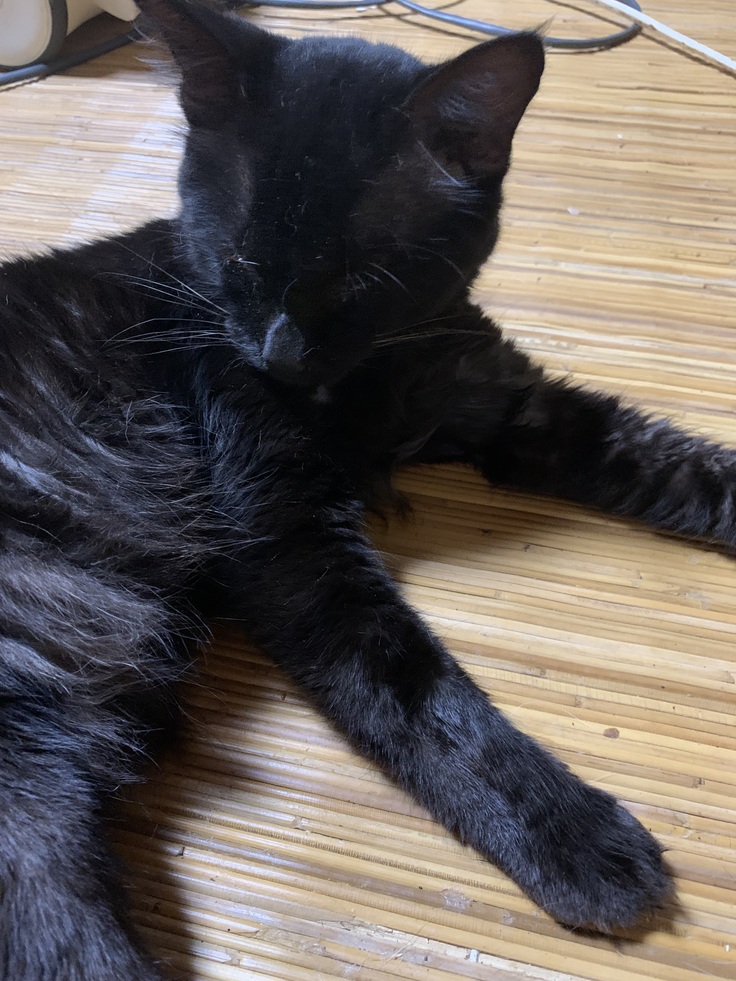 仔猫がお店の庭にいると連絡がきて行ってみると真っ黒の仔猫が1匹生後2ヶ月ちょいだったけど逃げていかずおかしいな?と思い捕まえるとシャーシャー怒ってくるのはいいけど
