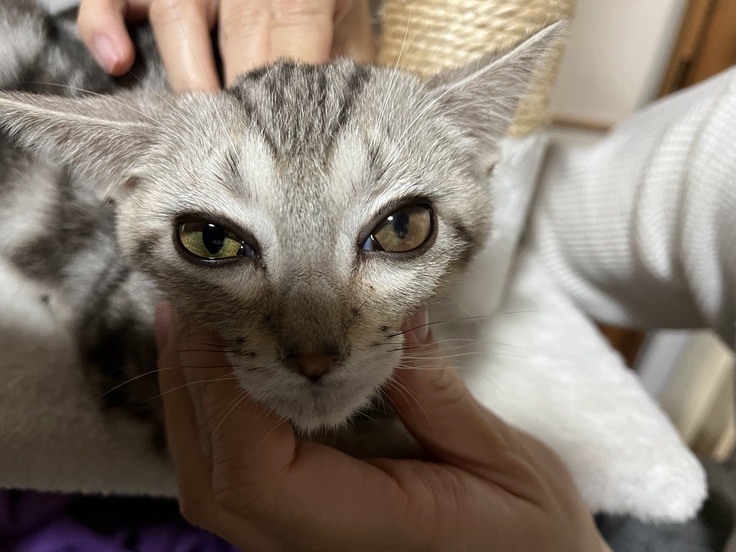 2023年12月、瞳孔の大きさに左右差があることに気が付き、目の病気を疑いかかりつけの病院を受診しました。かかりつけ病院では異常が見つかりませんでしたが、これまで感じていた違和感もあって、セカンドオピニオンを受けました。血液検査の結果、命にかかわる難病のFIPである可能性が高いと告げられました。ただ目の病気を疑っていて、難病であることは想像していなかったためとても驚きましたが、何としても助けようと決意し、すぐにFIP治療が可能である病院を探し、治療を開始しました。遠方にある病院でしたが、小さな命を救いたい一心で通いだしました。