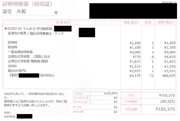 FIPの治療薬は何種類か存在しますが、いずれも日本国内では認可されておらず、非常に高価なものばかりです。また、12週間毎日継続して投薬が必要であり、その治療費は一般的な病気の治療と比較すると非常に高額です。しかしらんまるの命を救えるなら...となんとか資金を集めて治療にあたってきました。実際に、12月~3月にわたる一次治療の費用(約62万円)は自己負担で支払うことができました。投薬治療も順調に終え、あとは寛解まで経過観察を行っているところでしたが、残念ながら体調が悪化し、再発が確認されました(2024年3月中旬に再発、クラウドファンディングのため5月に診断書をいただきました)。