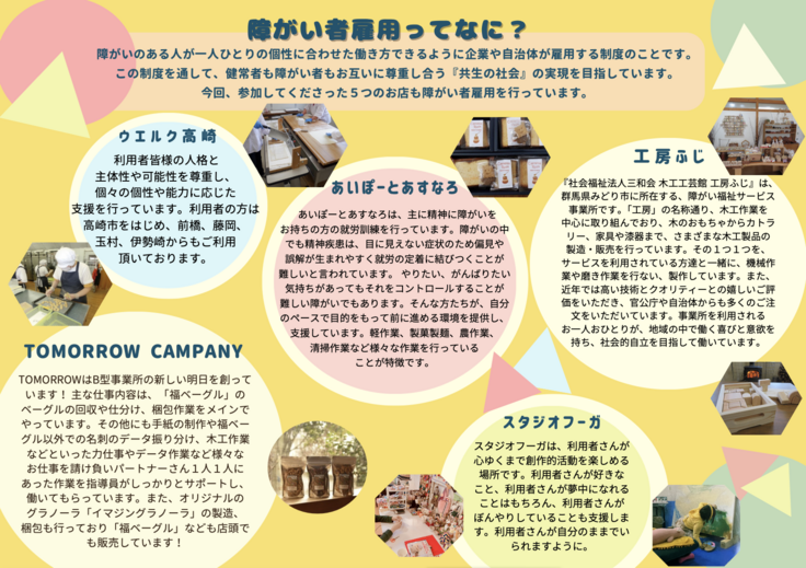 今回学生たちが制作し、会場で配布した「障がい者雇用」に関するパンフレットを、増刷してさらに多くの方に見ていただきたいと考えています。