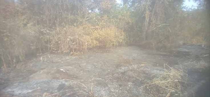 ハイムンドさん (イランドゥーバ市生産者) の土地の様子 火が入り川べりの斜面が全て焼け、下から草が生えている。2025年1月下旬 |