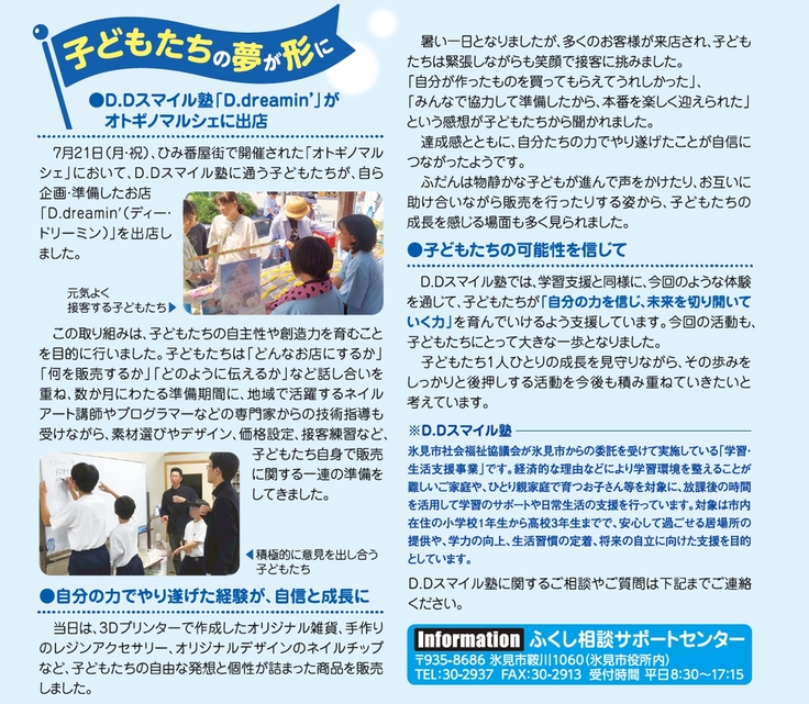 氷見市社会福祉協議会「学習・生活支援事業」と連携:D.Dスマイル塾で子どもたちと制作 → マルシェで販売し完売!「ひみのふくし10月号」冊子に掲載