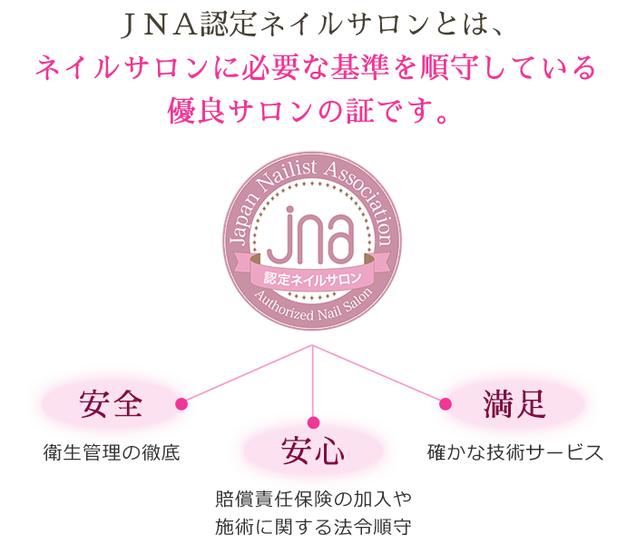 JNA認定ネイルサロンは、確かな技術に加え、衛生管理やコンプライアンスなどの条件をクリアしているとJNAが認定したネイルサロンという証です。