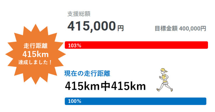 9月6日に無事目標を越える41万5000円を達成しました。1万円につき、1キロ走るという約束をいたしましたが、同日までに415キロを3人で走りました。