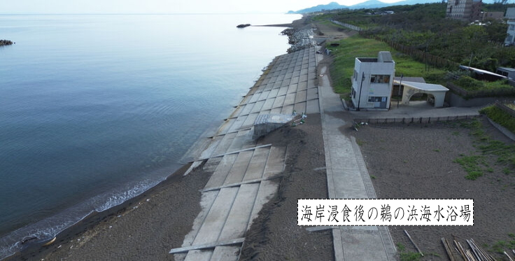 波に持っていかれてコンクリートがむき出しになった鵜の浜海水浴場です。