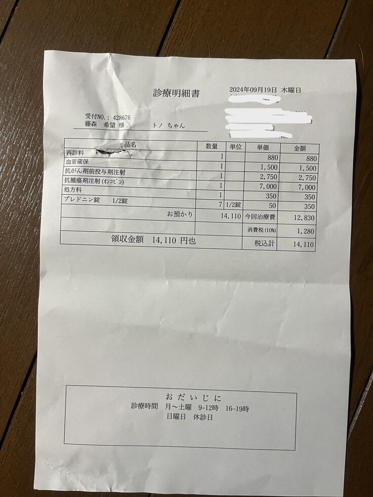 一部破損してしまいましたが、昨日の領収書を添付しておきます。