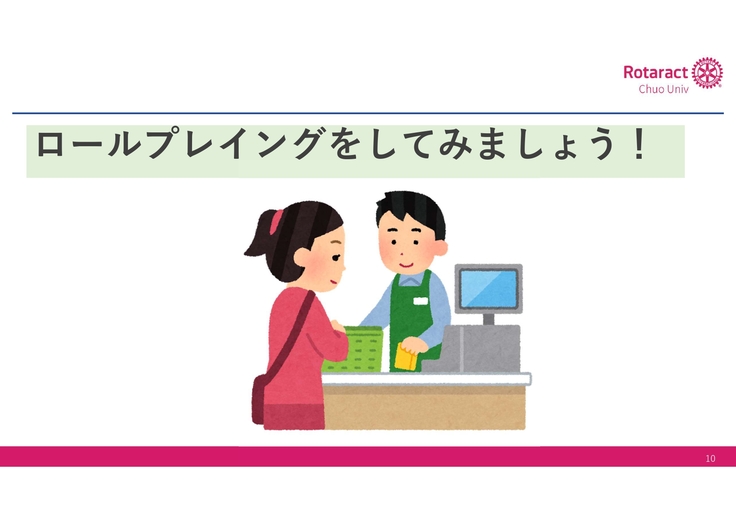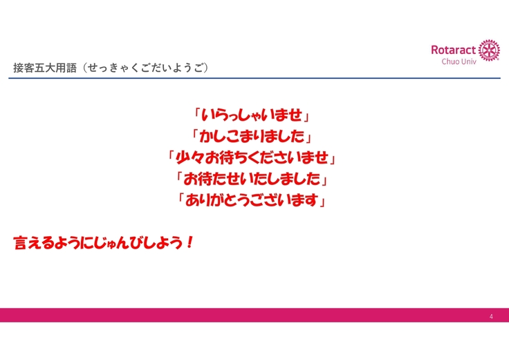 接客五大用語を皆で唱和してロールプレイングをしましたが、
