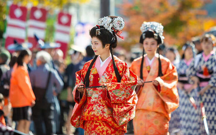 お通りは広島県の中でも1番北東に位置し歴史ある町並みが残っている東城町で開催される古くからあるイベントです。爽やかな秋晴れのもと華やかな時代絵巻が列をなして町を練り歩く。特に目を引くのが「母衣の行列」です。飾り等で母衣を祭り仕様に仕立てたのは東城だけです。
