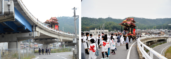 まつりの場となる氏子地域は明治期の鉄道の開通により駅の東西に分断されており、人力で曳山を引き、新幹線をまたぐ跨線橋を越えていきます。