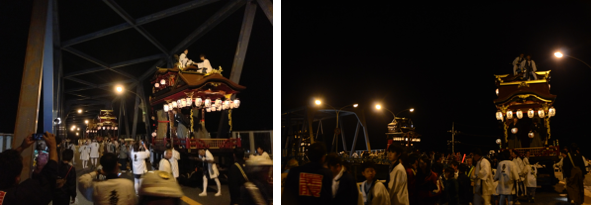 この頃には曳山の提灯に灯が入り、幻想的な曳山が跨線橋を越えて行く姿をご覧いただくことが出来ます。