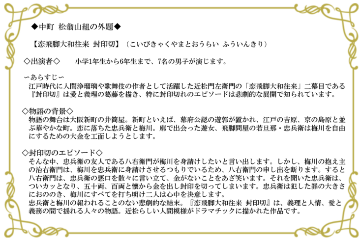 子供歌舞伎(狂言)は、地域の小学校一年生~六年生の男子が役者として出演します。