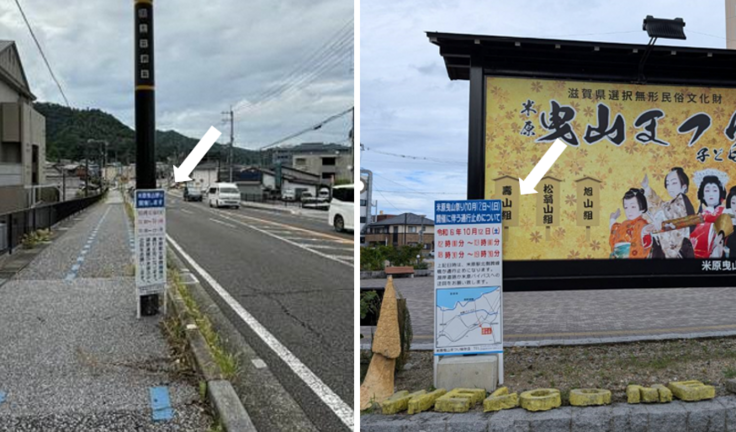 開催に向けて、曳山運行規制周知の看板取り付けを行い、
