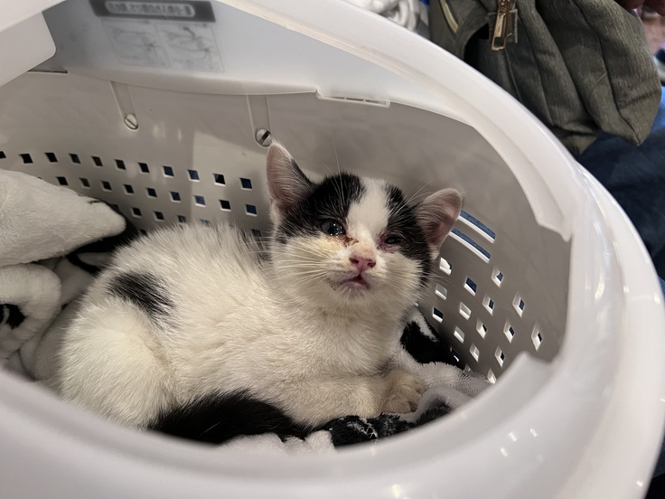 まだまだ小さな子猫、連絡くれた方が病院に連れて行ってくださり、鼻、眼、風邪でしょう、との事、でお預かりし点眼などの治療をしながらご飯は自力ではたべないため、無理矢理口に、よくよく見ると呼吸が深くて早くて、、、