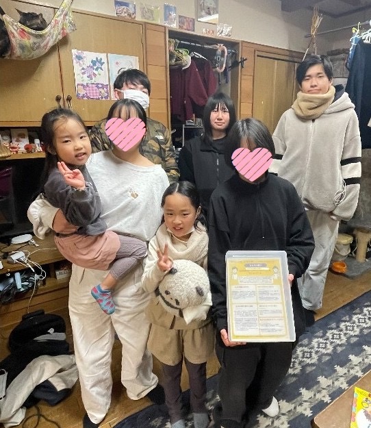 もうひとつは、倉橋先生のご自宅くちゃんハウスにお伺いし、里親家庭の里子姉妹と実子に手渡しをしました。