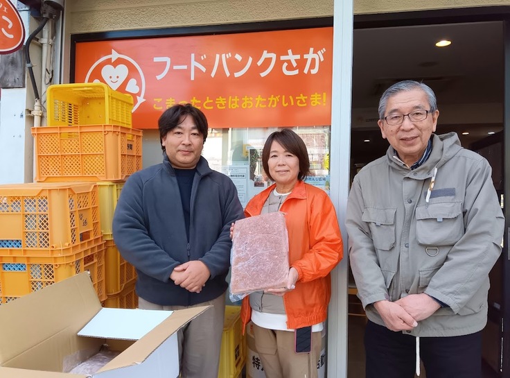 鳥栖市にある岩田屋フーズ鳥栖工場様よりチャーシューをいただきました。今後も利用状況を見ながら提供いただけるとのことです。味はついていないため野菜炒めなどで活用してくださいとのことです。社長様が生活に困窮するひとり親家庭やその子供たちを応援するために活用してほしいとのことです。提供いただいた12月10日には保坂専務様が直々唐人倉庫に届けていただきました。高額のお肉のご提供の機会は少なく、貴重なものとなります。本当にありがとうございます。一番左側が保坂専務様です。