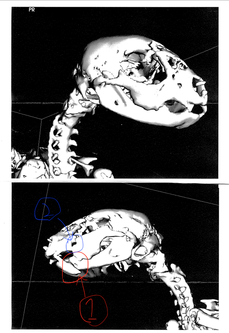 併せてCT画像データになります。①が診断書にもあります、下顎骨折、②は上顎が少しヒビ割れております。