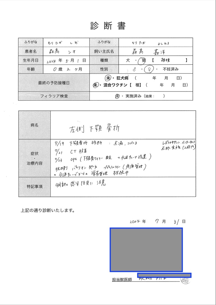 顎は手術しましたが、鼻の骨のズレの方は今の仔猫の大きさだと手術不可のため様子見ということで、費用等かかっておりません。