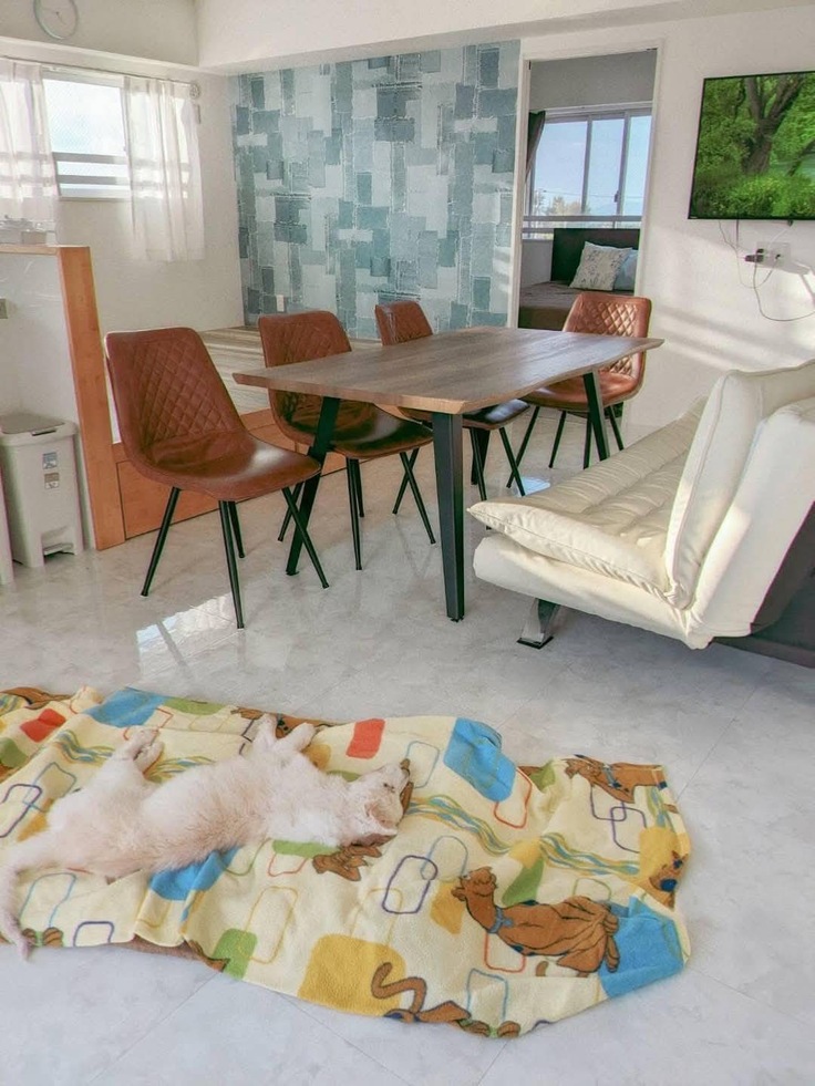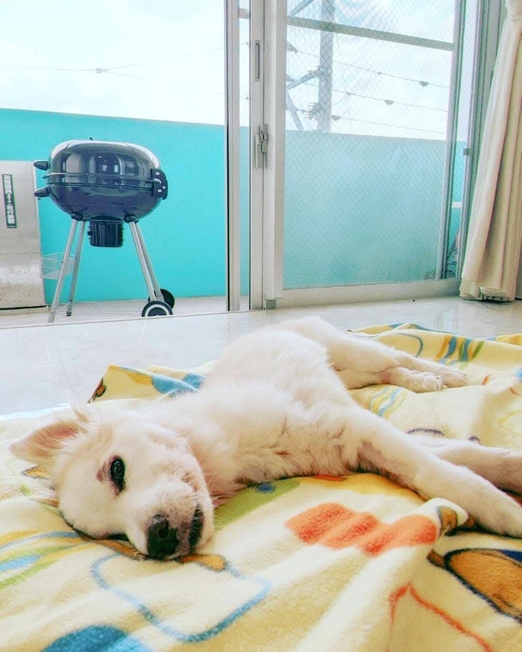 とても痩せ細っていたので心配で日中も仕事場に置き、目の届く範囲で生活していました。