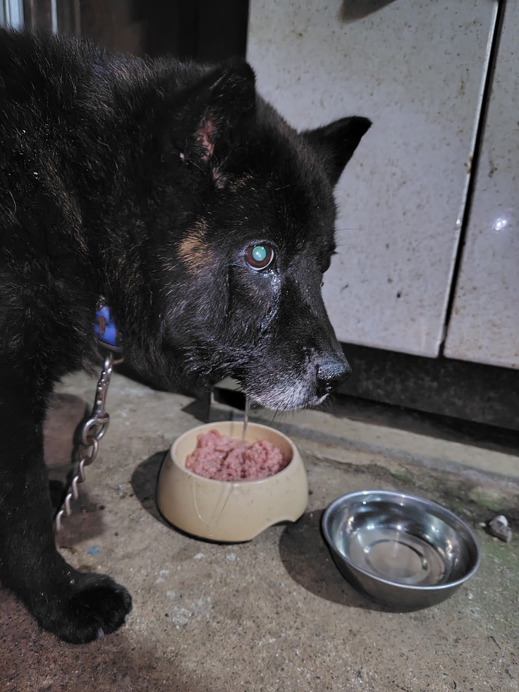 夜ご飯は散歩の後1時間くらいしてからあげましたがよだれが口から垂れてきたりポタポタ落ちたりとなかなか気持ち悪さが落ちつかず、また夜ご飯もぼちぼち時間をかけて食べてました。日によって体調もいろいろです。下の写真はよだれがつららのようになってます😅今日は調子が良くなかったです😰