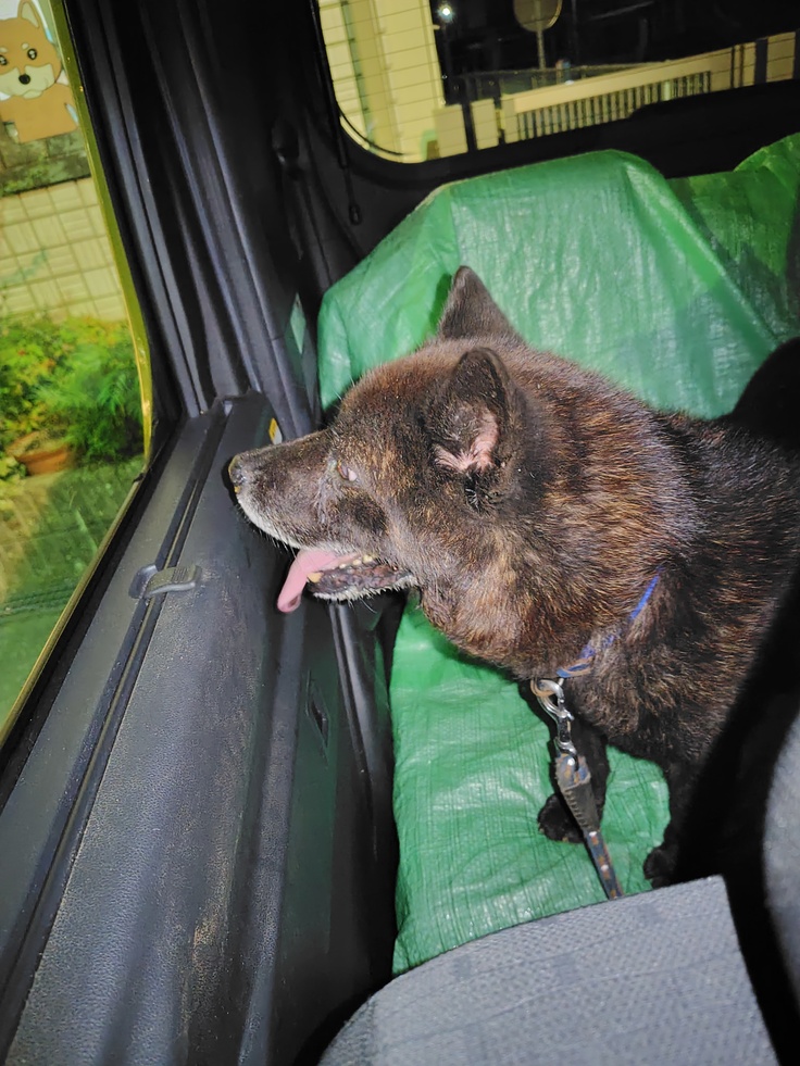 昼間は暑くて息遣いも荒く寝ていまして夕方またもどしたりしてましたが、今日は夕方早めに散歩に行き、週1回の点滴に病院に行きました。車の中ではちょっと調子良く立ってウロウロしていました。