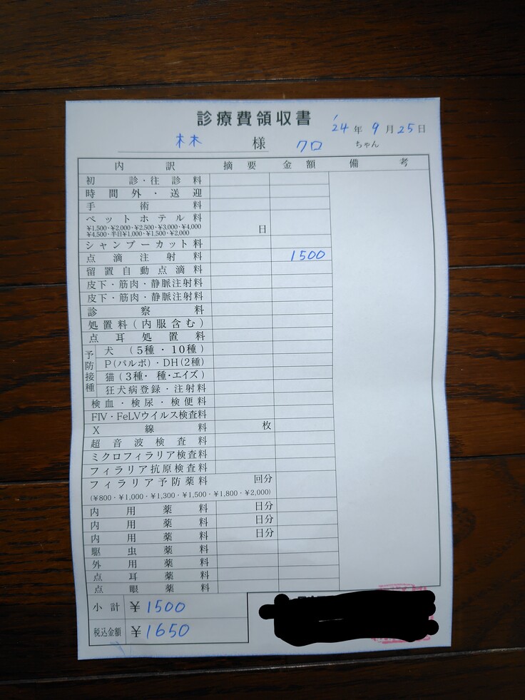 週に一度の皮下点滴に行きました。吐き戻しのため脱水症状になるためしてもらいます。
