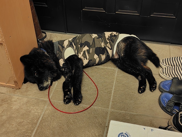 10月8日に退院後初めての検診に行きました。クロちゃんまだ痛みがあるのか息を吸う時に小刻みに震えがありますが、鳴いたりは全くなく落ち着いています。胃瘻での食事も私もやり方慣れてきまして少しスムーズにできるようになりました。クロちゃんは本当にお利口さんで、私が1人でチューブからご飯あげてますからじっと立っていてくれたり寝ころんでいてくれたり🥰本当に有り難いです😂まだ痛みがあるからか動きもあまり無く寝ている事が多いです。