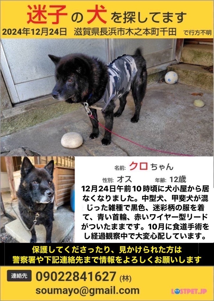 インスタにて捜索をいろいろな方法にてさせていただき投稿させていただいたり心苦しい思いですが直接支援をお願いし、ペット探偵さんをお願いしたりもしました。しかし見つからず、聞き込みしたりチラシも新聞に折り込みさせていただいたりお店に貼り紙をさせていただいたりしても、目撃情報が入って来ない状況です。何件かクロちゃんではないかとご連絡いただきましたが、そちらを探しに行きましてもなかなか見つからず、本当に目撃情報が少なくこんなにも見つからないのかと毎日心配でどこを探したらよいやら、2ヶ月近くになりかなり遠くに行ってしまっているのか、近くで保護していただいていたら良いですが、どこかで寒い中しのいでいるのか。保護していただいてたら連絡があるはずですが、警察署や保健所、愛護センターなどの連絡はありません。携帯番号にもクロちゃんだとはっきりした情報がありません。
