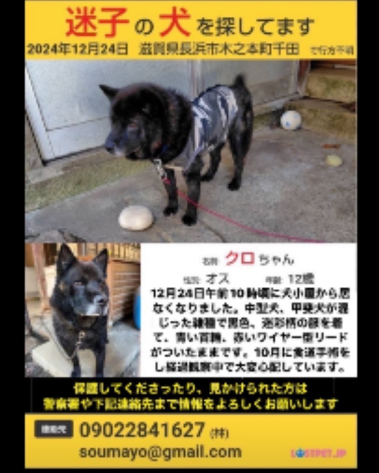 引き続きクロちゃんを見つけ出すまであきらめずに毎日探し続けます。また必ずクロちゃんの元気な様子をご報告できますように捜索を頑張りますので今しばらくお待ちいただけたらと思います。