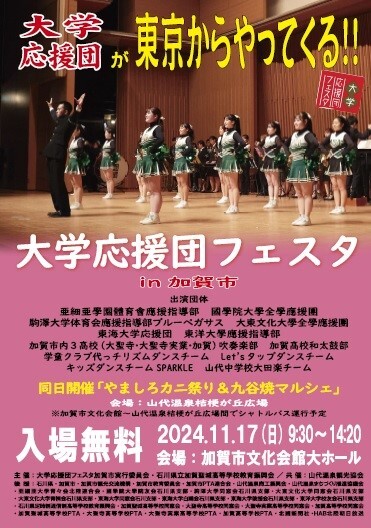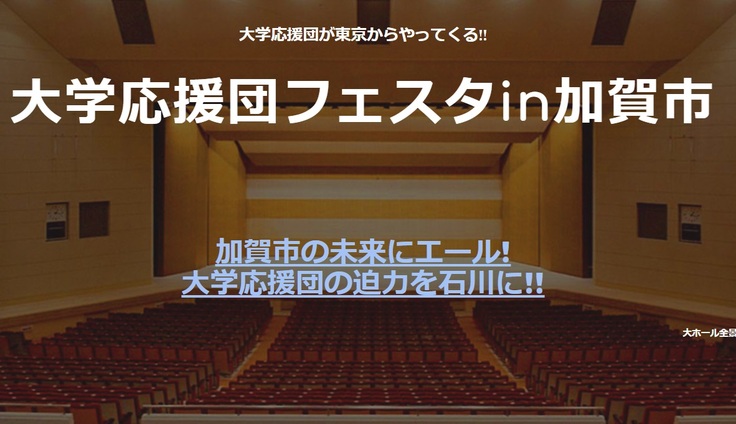 私たちは、本年11月17日(日)に石川県加賀市文化会館において、「大学応援団フェスタin加賀市」を開催いたします。