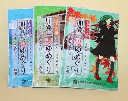 地元の高校、石川県立大聖寺実業高等学校生が開発した商品です。加賀片山津温泉、加賀山代温泉、加賀山中温泉の三湯をイメージした入浴剤でお湯の色や香りは地域の温泉のイメージカラーに合わせています。