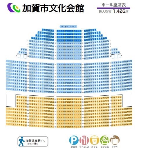 会場の加賀市文化会館大ホールの6~10列の座席を、1支援につきお二人分確保させていただきます。詳細につきましては、後日ご連絡いたします。